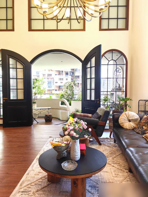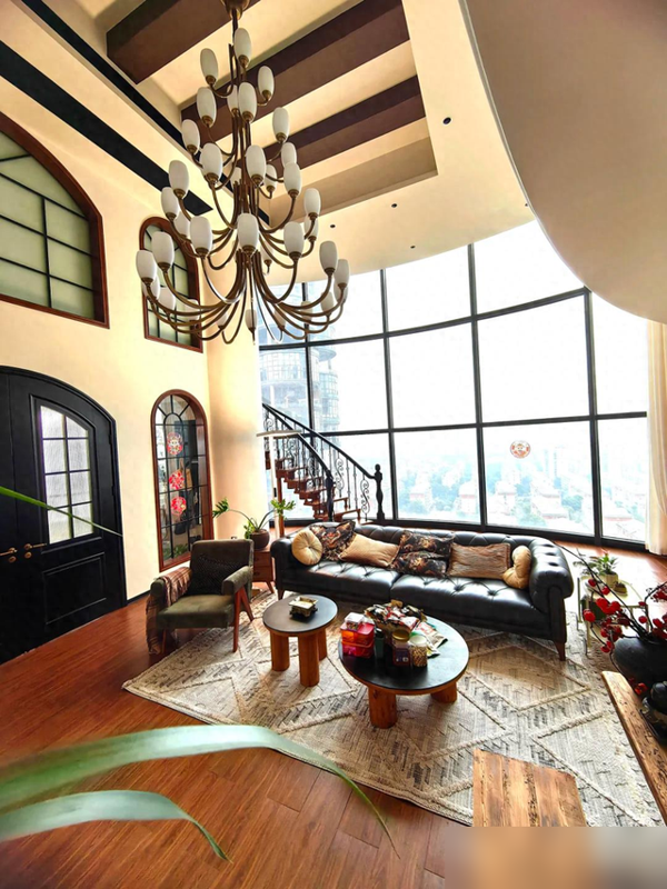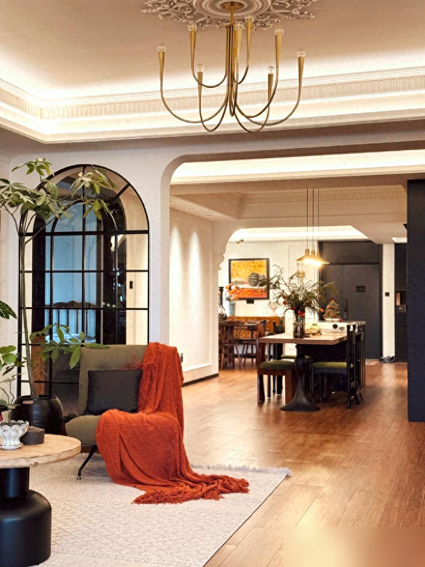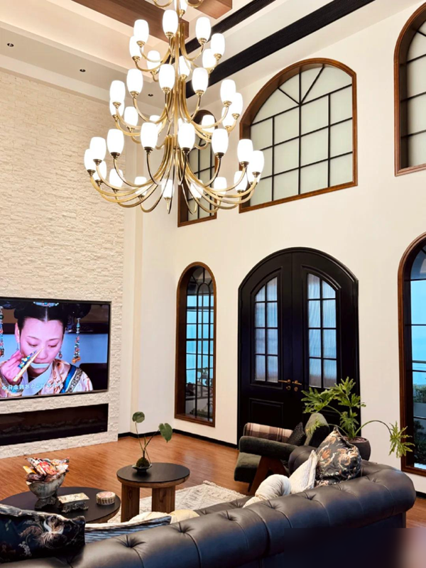 阔绰的挑高客厅配落地格子窗,5组拱形假窗把天光揉碎洒进室内,深棕横梁压住空旷感,垂一盏金铜吊灯镇场子。