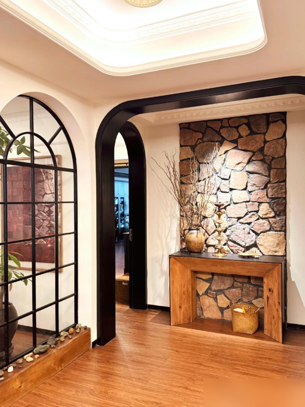 棕红木地板撞上白文化石,龟背竹的影子在弧形门洞下晃荡——这才是大宅该有的呼吸感!