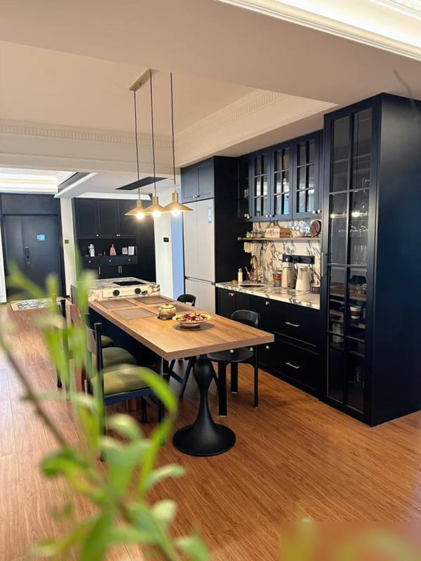 再看这套美式复古混搭,现代沙发配雕花柜不违和,岩板台面接实木餐桌也妥帖。